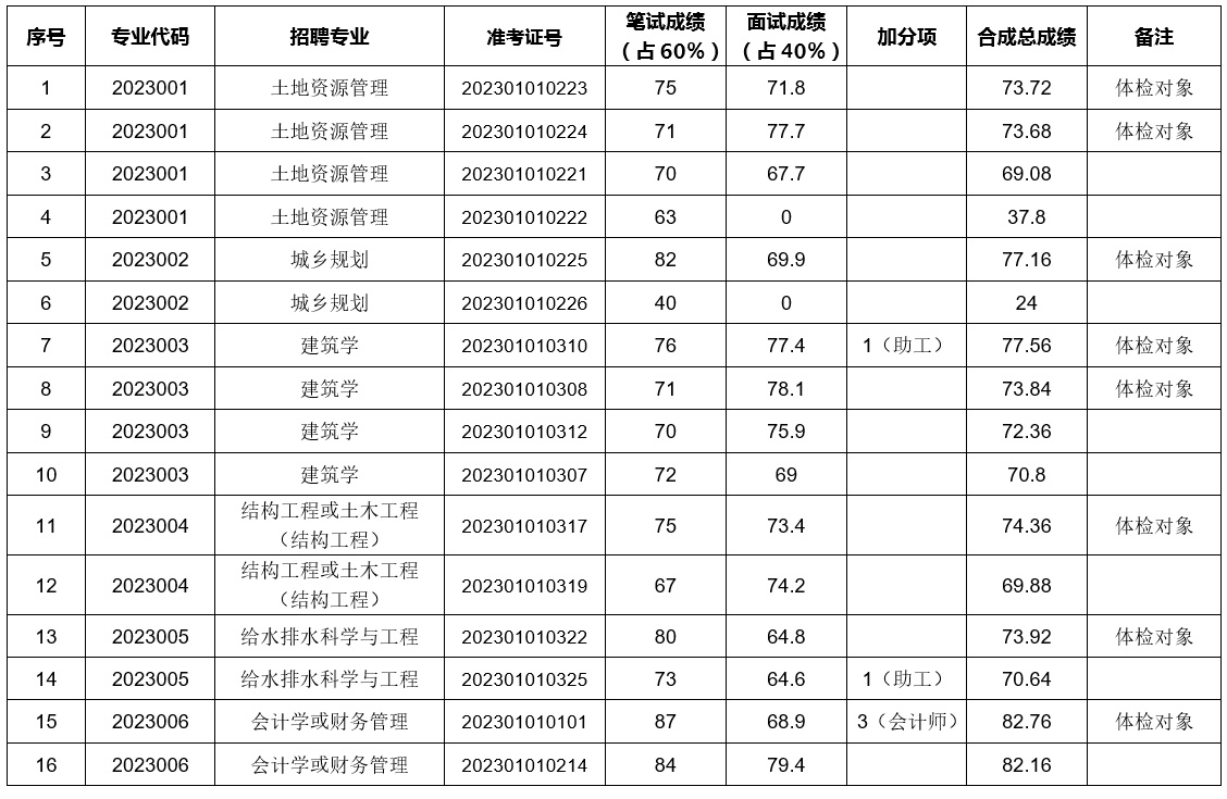 根據(jù)《2023年度滁州市城鄉(xiāng)建設(shè)規(guī)劃設(shè)計院有限公司公開招聘技術(shù)人員公告》規(guī)定,現(xiàn)將2023年度滁州市城鄉(xiāng)建設(shè)規(guī)劃設(shè)計院有限公司公開招聘技術(shù)人員筆試、面試、加分合成總成績和體檢對象公布如下: