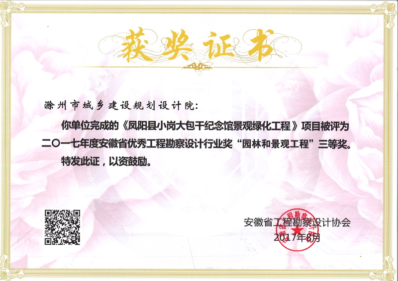 鳳陽縣小崗大包干紀念館景觀綠化工程獲獎證書
