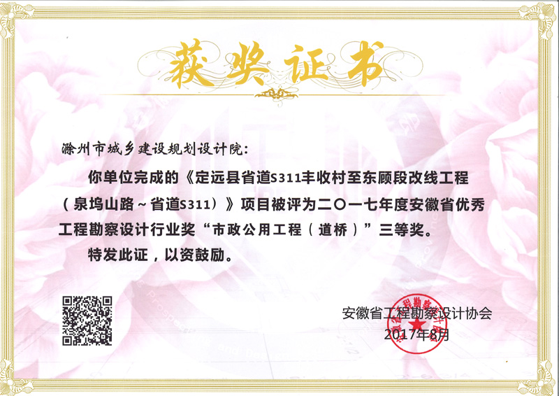 定遠縣省道S311豐收村至東顧段改線工程獲獎證書